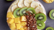 - Transfer to serving bowl and top with kiwi fruit, banana, mango and granola.