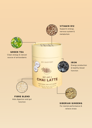 WHAT? - Functional Chai Latte blend infused with energy-boosting Iron and Vitamin B12 to fight fatigue. - Botanicals to help you stay sharp and focused. - Added Fibre blend to aid digestion. WHO? - Anyone looking for a gentle energy boost. - Chai Latte lovers. - Those looking to reduce their caffeine intake. WHEN? - Natural energy source so best enjoyed in the AM